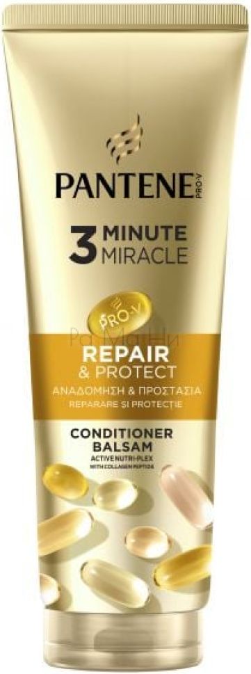Pantene PRO-V Repair & Protect 3 Minute Miracle (Пантен Про Ви Рипеар Анд Протект 3 Минът Миракъл) е интензивен балсам за коса, който действа като дълбока възстановяваща терапия само за 3 минути. Формулата с Pro-V комплекс и активни подхранващи съставки прониква в дълбочина, за да възстанови увредената структура на косъма, да намали накъсването и да възвърне здравия вид на косата.