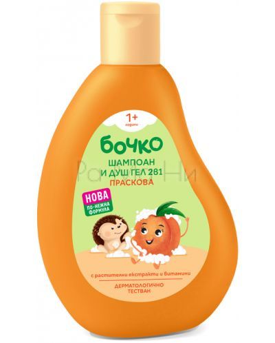 Бочко детски шампоан и душ гел 2в1 с аромат на праскова, 250 мл, осигурява нежно почистване на косата и тялото, съобразено с чувствителната детска кожа. Свежият прасковен аромат прави къпането приятно и освежаващо.