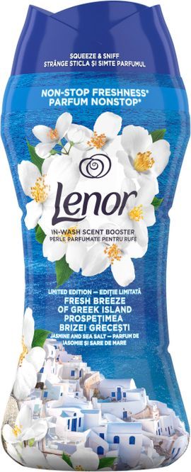 Lenor Perfume Pearls Fresh Breeze of Greek Island са специално създадени, за да обогатят прането ви с изискан аромат, вдъхновен от лекостта на морския бриз и цветята на гръцките острови. Съчетанието от жасмин и морска сол създава усещане за чистота, свежест и спокойствие. Перлите се изсипват директно в празен барабан на пералнята, където се разтварят напълно по време на цикъла, без да оставят остатъци. Подходящи са за всички видове тъкани и температури на пране. Те осигуряват интензивна ароматна свежест, която може да се усеща до 12 седмици при съхранение на дрехите в гардероб. Lenor Perfume Pearls ( Ленор Парфуме Пеарлс Фреш Брийз оф Гриик Исланд ) са отличен начин да добавите персонализиран аромат към прането си, без да прибягвате до допълнителни омекотители.