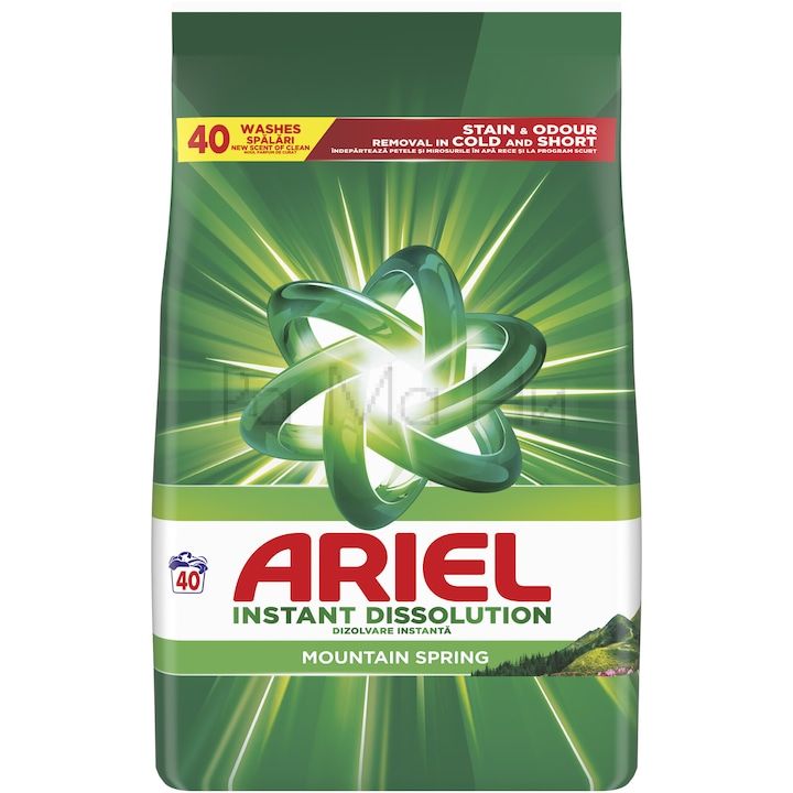 Ariel Instant Dissolution Mountain Spring ( Ариел Инстант Дисолюшън Маунтаин Спринг ) е висококачествен прах за бяло пране, създаден за дълбоко почистване и защита на белите дрехи. Формулата му се разтваря мигновено, гарантирайки равномерно действие и ефективно премахване на упорити петна още при първото пране. Препаратът поддържа белотата на тъканите, предотвратява пожълтяване и оставя мек и свеж аромат на планинска пролет. Подходящ за различни температури и видове перални, той предлага икономично и надеждно решение за ежедневна грижа за белите дрехи.