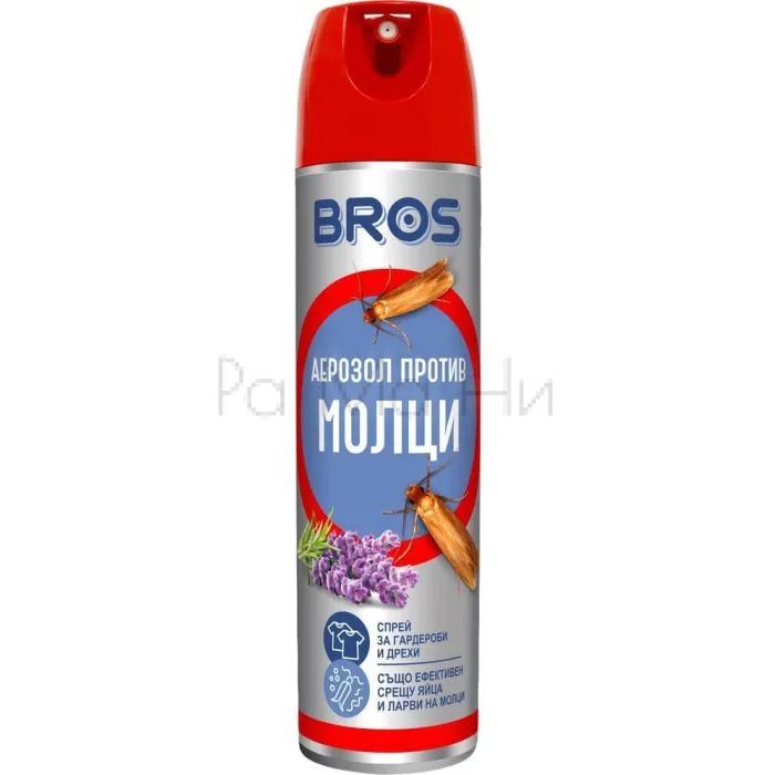 BROS Аерозол против молци с аромат на лавандула (150 мл) е специализиран продукт за защита на дрехи и текстил от молци. Благодарение на активната си формула, аерозолът ефективно отблъсква и унищожава молците, предпазвайки тъканите от увреждане.