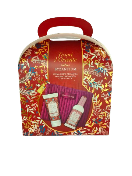 Tesori d'Oriente Byzantium Комплект за Жени е елегантен подаръчен сет с ароматна тоалетна вода 100 мл, ароматен крем за тяло 75 мл и стилна малка дамска чанта, вдъхновен от ориенталски лукс и женственост.