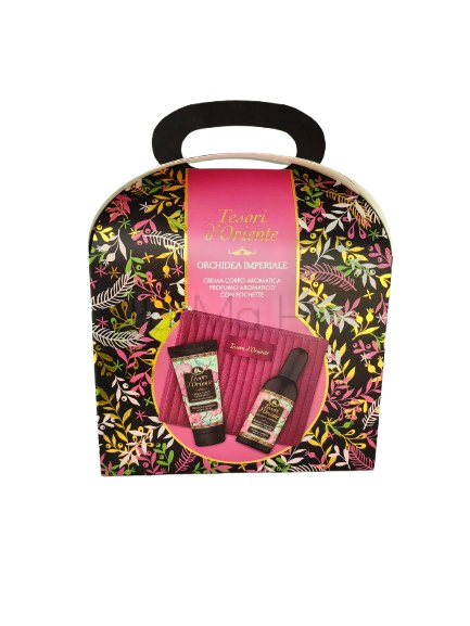 Tesori d’Oriente Orchidea Imperiale Комплект за Жени включва ароматна тоалетна вода 100 мл, крем за тяло 75 мл и стилна малка дамска чанта – луксозен, чувствен комплект за изящна ежедневна грижа и допълнение към всяка визия.