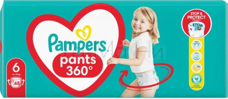 Pampers Pants 6 Jumbo Pack са детски пелени-гащи за пораснали деца с тегло над 16 кг. Те осигуряват до 12 часа сухота и защита от протичане, като позволяват на детето да се движи свободно и удобно. Опаковката съдържа 48 броя.